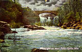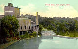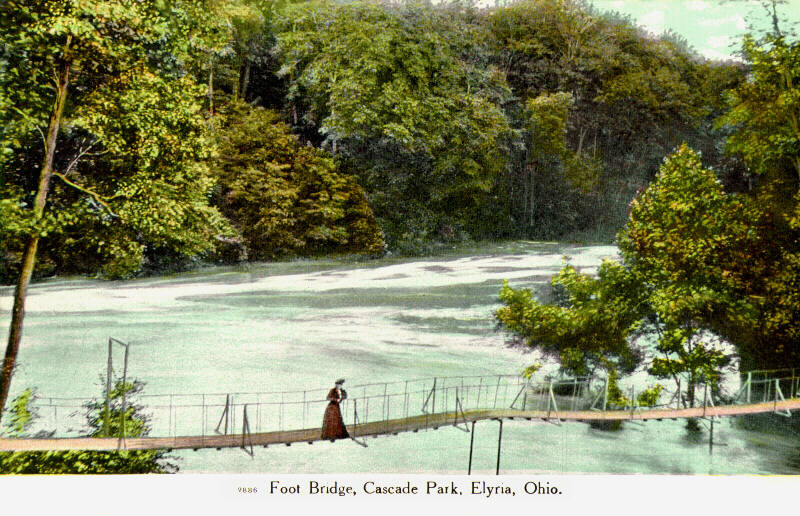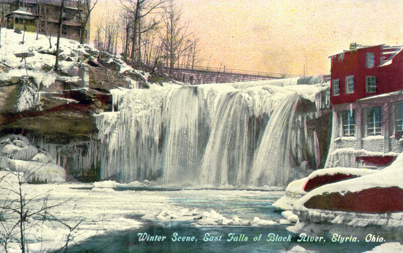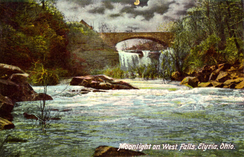 A romantic, hand-tinted photo of the falls on the west branch of the Black River. This "night shot" was taken from the confluence of the two branches in what is now Cascade Park. The magnificent stone bridge of Lodi Street, now Lake Avenue, was built in 1894 and still stands today. Look closely and you'll notice a horse-drawn carriage up on the bridge! |