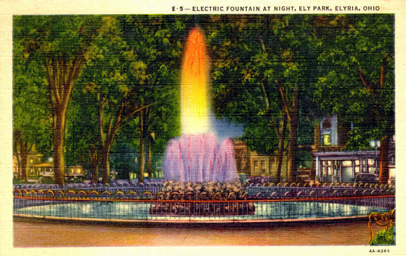 There have been several different fountains in Elyria's town square over the years. This fountain from the 1930's was one of the first "electric" fountains in the country. Its nightly illumination was said to attract "untold thousands of tourists". |
