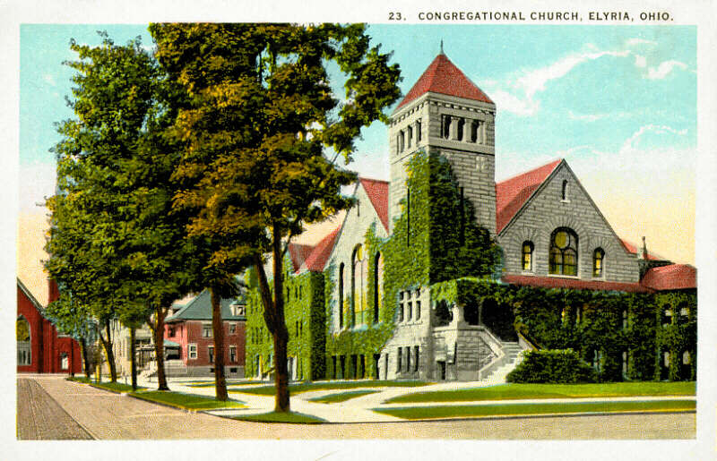 One of Elyria's many beautiful old churches, "First Cong" is located on the town square. Built in 1898, the ivy was removed as part of remodeling efforts in the 1980's, but it retains the massive sandstone entrance, beautiful Tiffany stained-glass windows, and an imposing bell tower. |