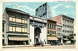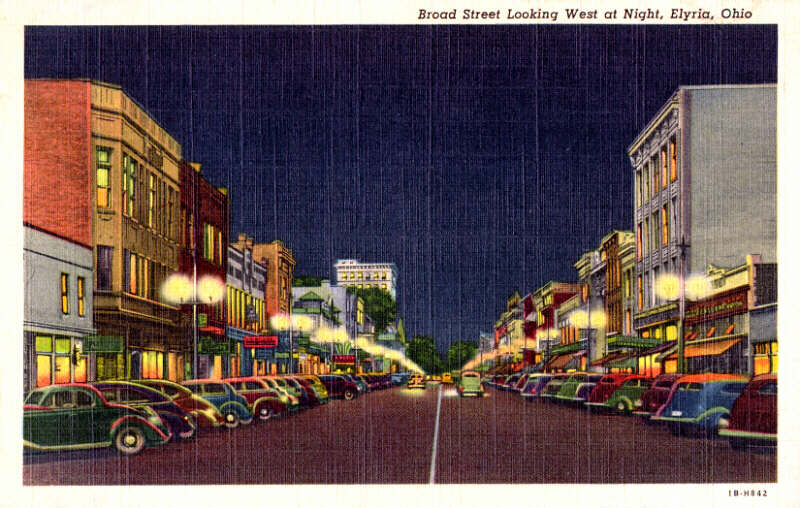 Broad Street in the mid- to late-1940's. Parking spaces are probably taken by movie-goers: note the Capitol Theater marquee between the 3rd and 4th lamp post on the left. A dramatic postcard that gives the romantic "feel" of old-time Elyria on a summer night. |