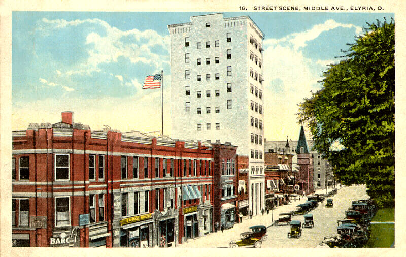 Elyria's first office tower, known for years as the Lorain County Bank building, was built in 1916 as the National Bank of Elyria. It is presently home to Lorain National Bank. Note the old Baptist church further down the street and the big molar-shaped dentist sign near the bank! |