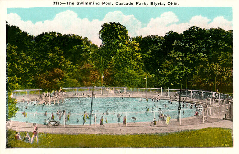 For many years Elyria's only public outdoor swimming pool was the Kiwanis Pool in Cascade Park. The "deep end", in the middle of the pool, was later marked off with a chain link fence. The pool was heavily damaged during the July 4 flood of 1969, but opened again the following season. After several modern pools were built around town, it was closed in 1986. |