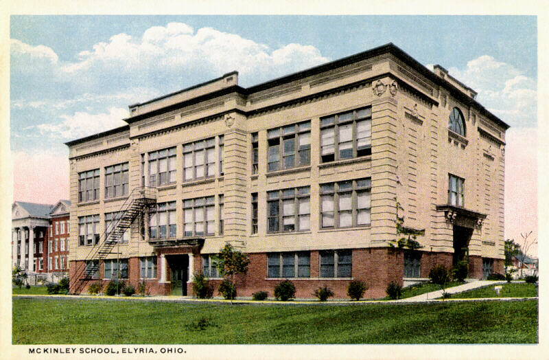 Situated on East River Road near Elyria Memorial Hospital, McKinley Elementary opened its doors in 1908. It is the oldest elementary school still in continuous use in Elyria. The dip between the road and the school is evidence of an old brick works which took clay from the site years before the hospital and school were built. |