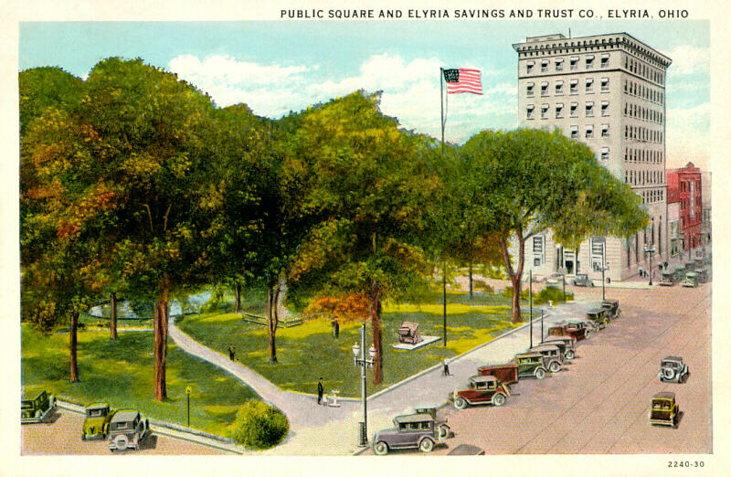 A rooftop view of Ely Park and the former Elyria Savings & Trust Bank building, circa 1930. In this view, overhead lines for the electric trolley (interurban) which once ran down Broad Street have been removed, and the horse watering pumps of earlier days have been replaced with public drinking fountains. |
