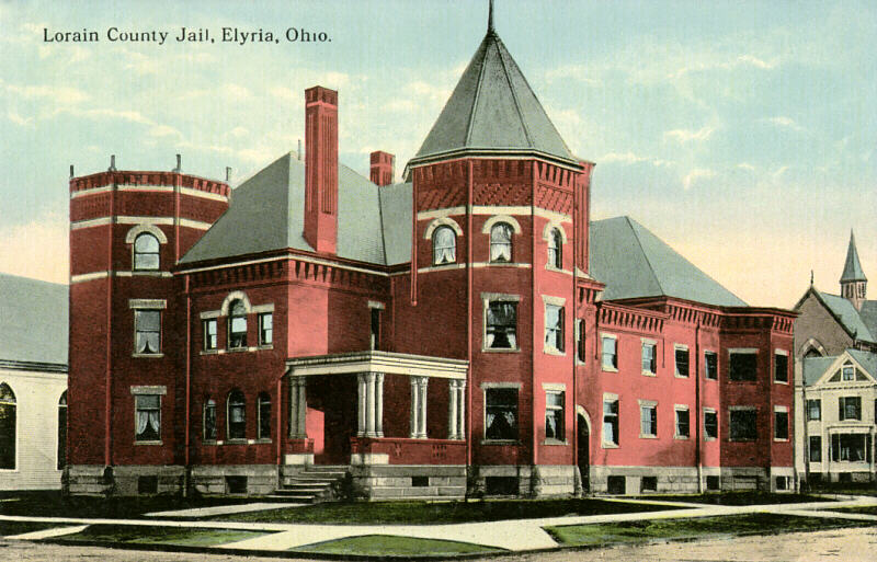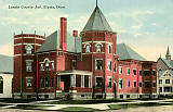 A landmark building in downtown Elyria, the Lorain County Jail dominated the corner of Middle Avenue and Third Street from 1893 to 1980. Prisoners stared from behind bars as law-abiding citizens shopped, banked, or strolled freely by. Buildings of St. Mary's Catholic Church can be seen nearby. |