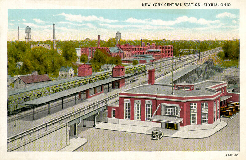 The New York Central train depot stands on the north-east corner of East Avenue and Depot Street. It opened in 1925, when 10 eastbound and 14 westbound trains stopped in Elyria every day! Hopes are to use the now-vacant building as a station for Amtrak, bus, and taxi service. (That's the old Colson Corp. in the distance.) |