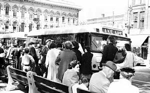 Shoppers, commuters, and visitors jam the bus stops on The Square. |