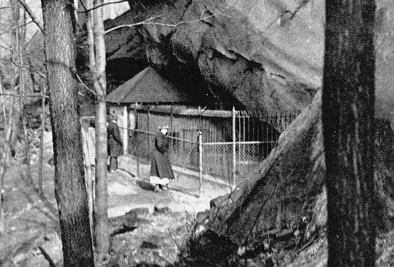 | Two black bears are kept in this cage built under a natural rock overhang. |